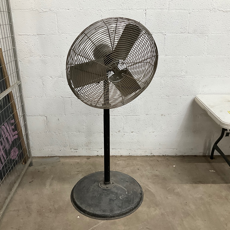 Large floor-standing fan with metal construction and a sturdy base, ideal for air circulation in spacious areas.