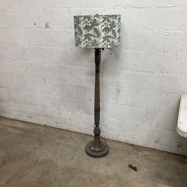 Vintage floor lamp with a wooden base and patterned fabric shade. Ideal for living rooms or reading nooks.