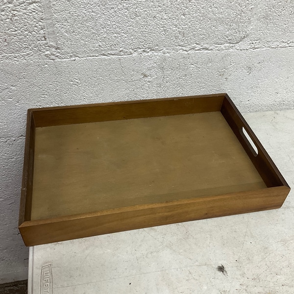 Vintage-style wooden serving tray, ideal for dining areas or kitchens, featuring cut-out handles for easy carrying.