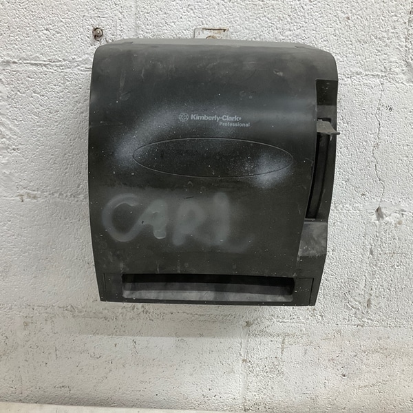 Wall-mounted paper towel dispenser for commercial use. Made of durable plastic with graffiti detailing.