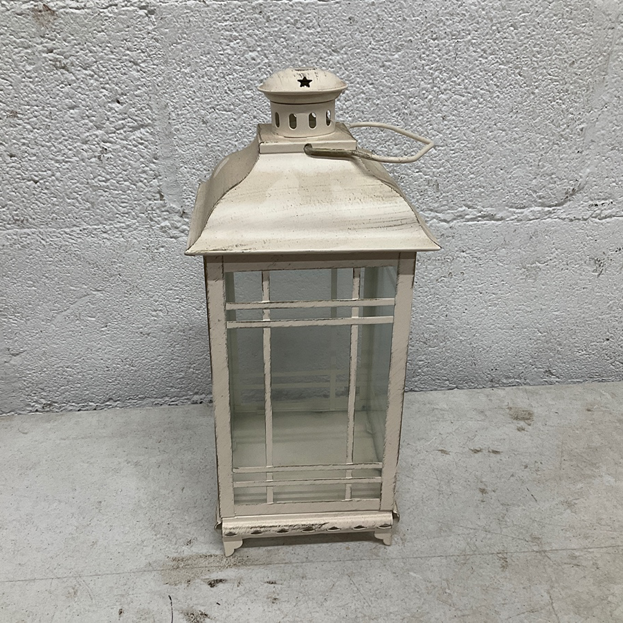 A vintage white metal lantern with glass panels. Ideal for decoration in living rooms, patios, or garden spaces.
