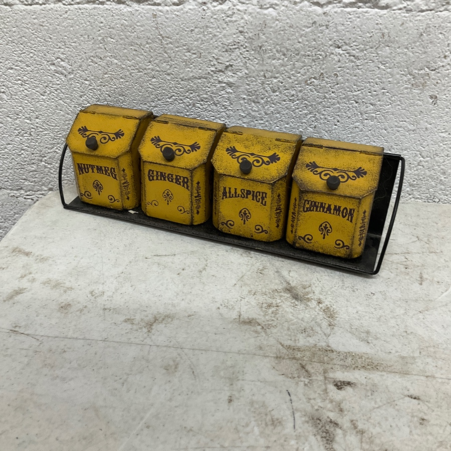 Set of vintage yellow metal spice tins with decorative text. Suitable for retro kitchen decor.