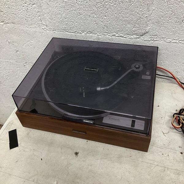 Retro turntable with wooden base and dust cover. Ideal for vintage music setups in living rooms or entertainment areas.
