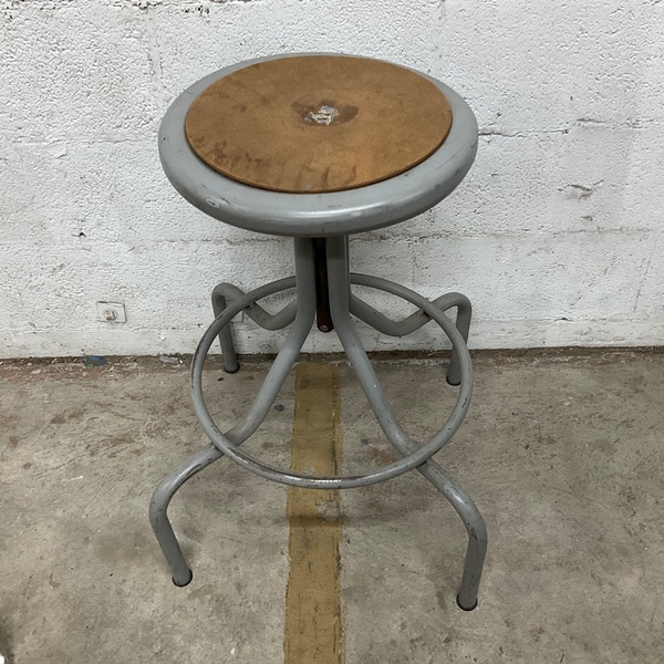 Sturdy industrial stool with a round wooden seat and metal base. Ideal for bars or kitchens, featuring a mid-century design.