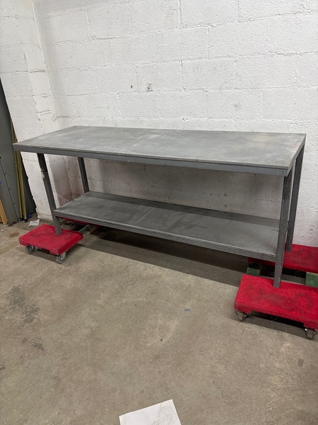 Sturdy metal workbench with a spacious tabletop and lower shelf. Ideal for garages or workshops.