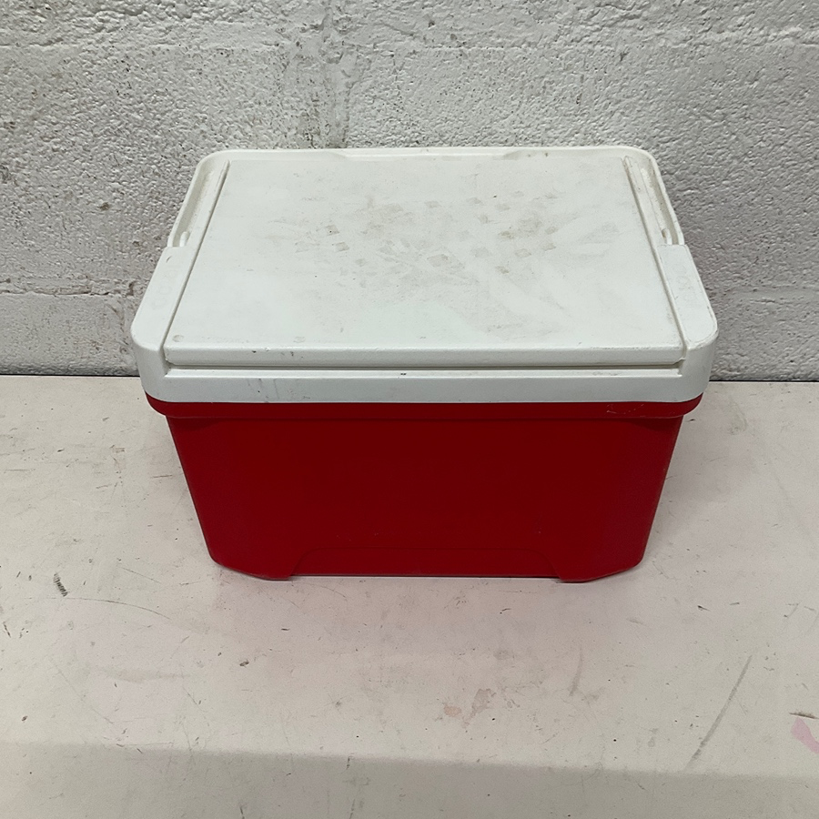 Durable red and white portable cooler for outdoor events. Perfect for picnics, camping, and beach trips.