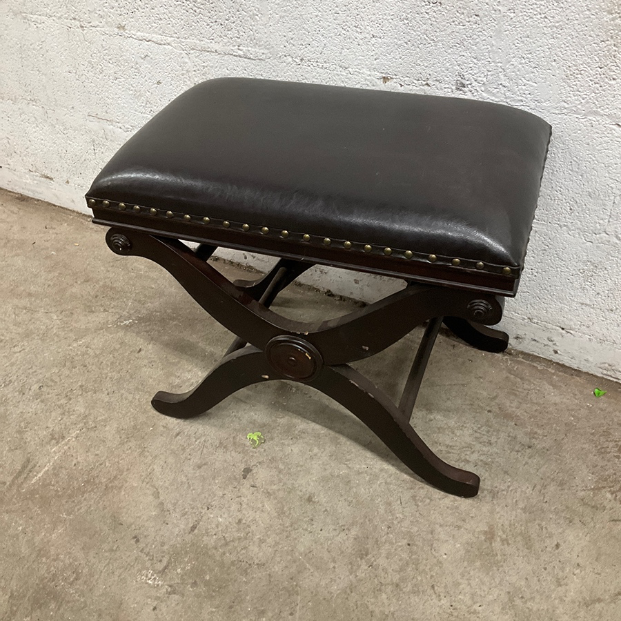 Classic stool with dark leather seat and wooden frame. Perfect for traditional settings or as a unique accent piece.