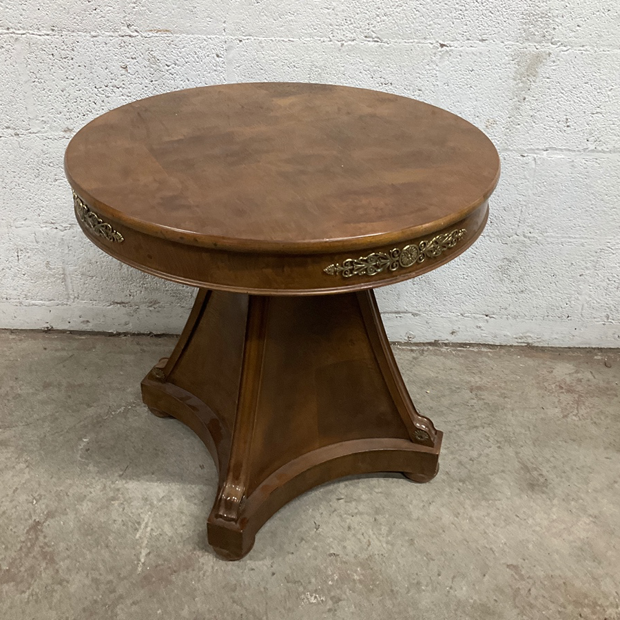 Classic wooden side table with ornate trim. Suitable for living rooms or study areas. Mid-century design.