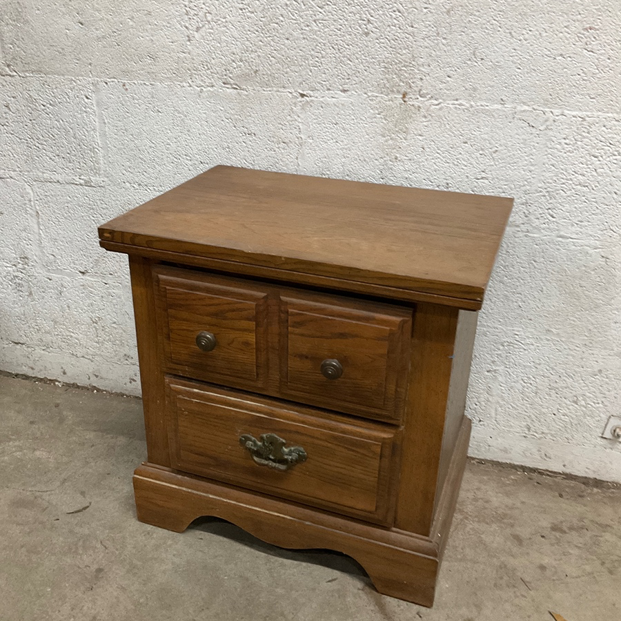 Mid-century wooden nightstand with three drawers and metal handles, perfect for bedroom storage.
