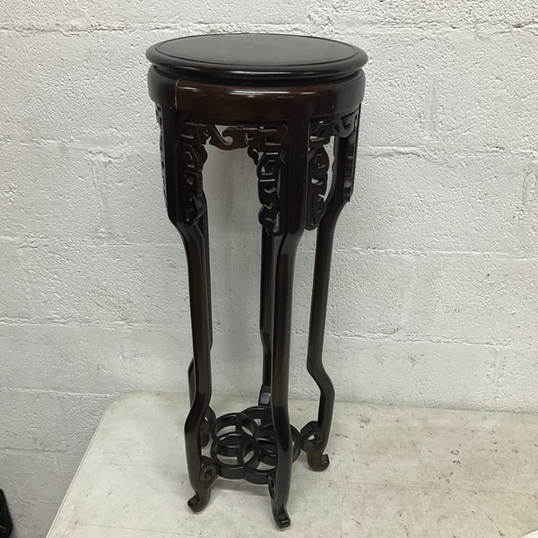Antique plant stand with intricate carvings. Dark wood, perfect for living room or hallway. Victorian-era style.