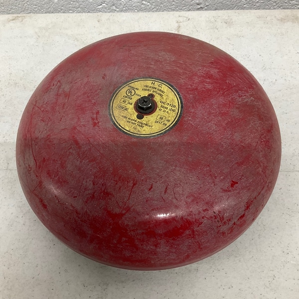 A round red fire extinguisher ball from the 20th century, ideal for industrial or mechanical settings.