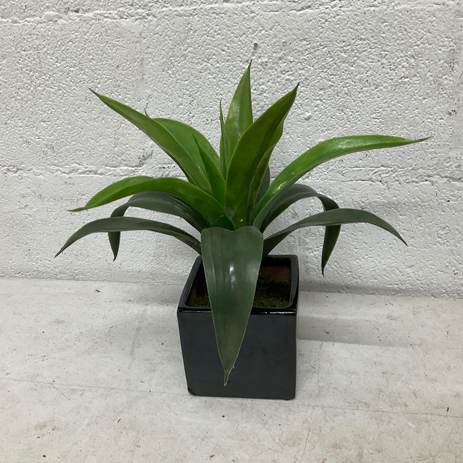 Lifelike artificial green plant in a black square pot. Perfect for modern interiors and low maintenance decor.