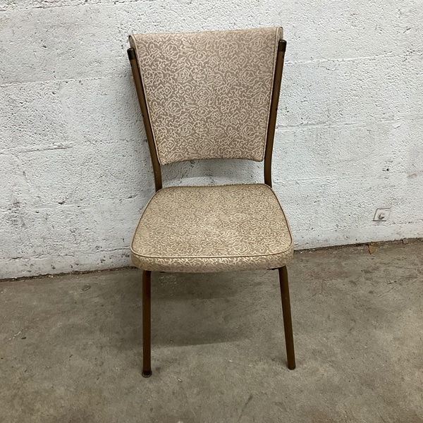 Retro-inspired chair with a patterned fabric seat and metal frame, ideal for dining rooms or offices.