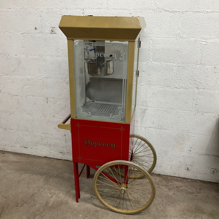 Classic popcorn machine with cart, ideal for home theaters or events. Features antique design and vibrant colors.