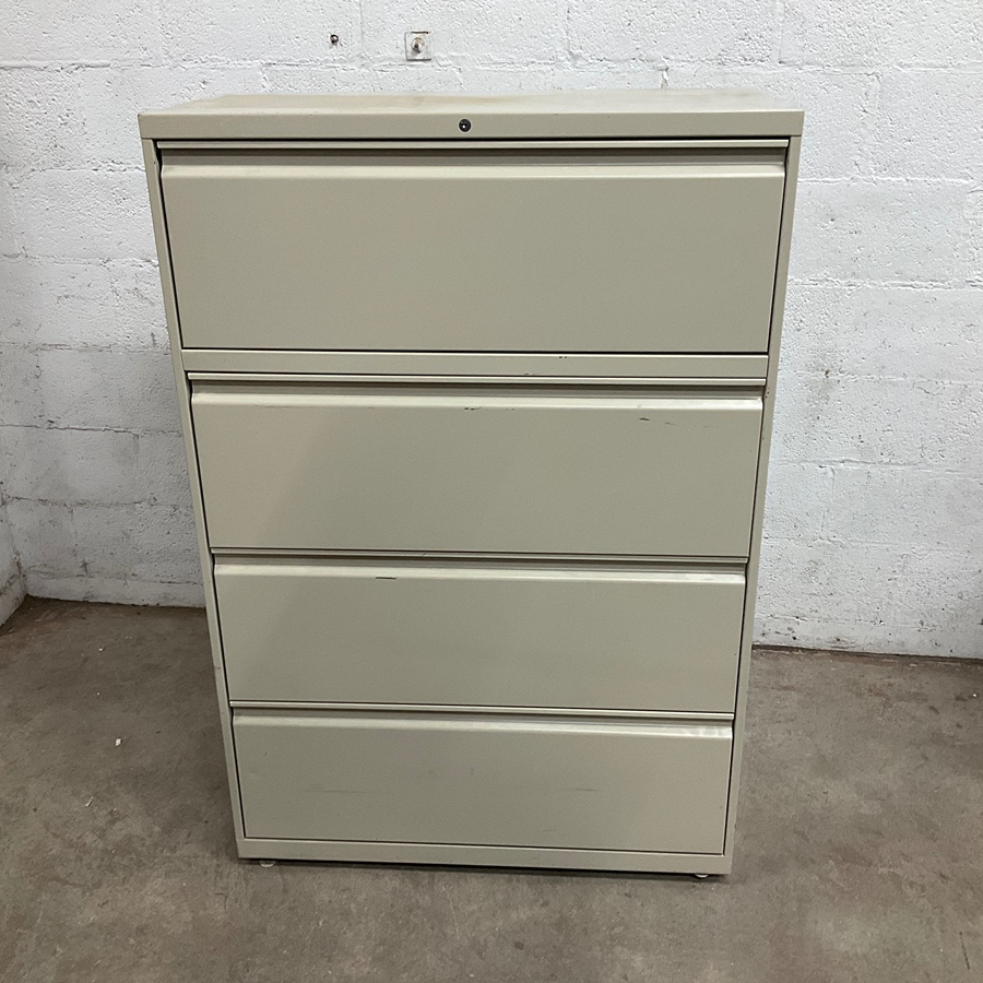 Sleek metal filing cabinet with four drawers, ideal for organizing office documents.