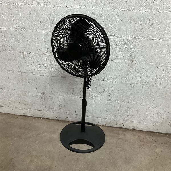 Modern black pedestal fan with adjustable height. Ideal for living rooms and offices. Provides efficient cooling.