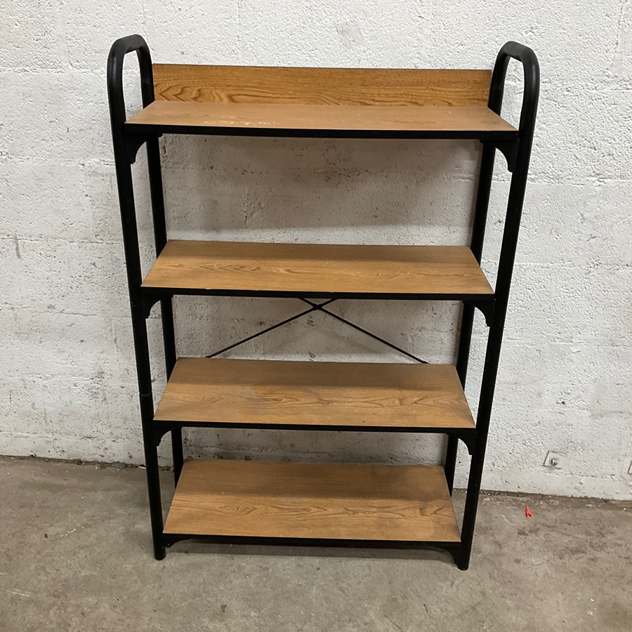 Four-tier shelf for living rooms or offices. Made of wood and metal, offering a modern industrial look.