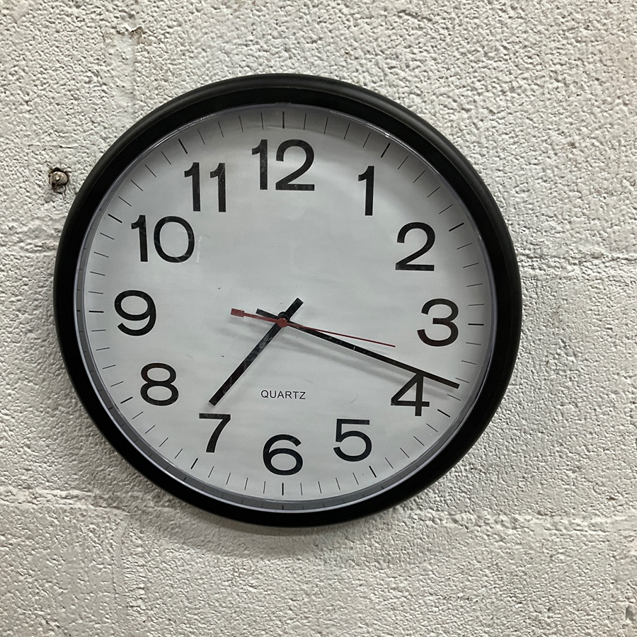 Quartz clock with white face, black numbers, and black frame. Ideal for offices or living spaces.