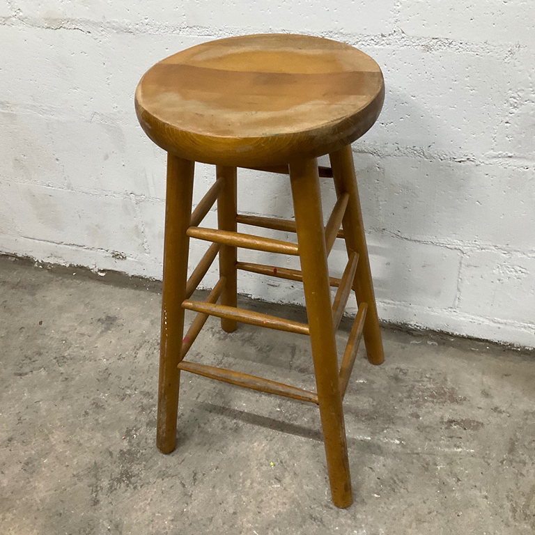 Classic wooden bar stool from the 1970s. Perfect for kitchens, bars, or dining rooms. Features a round seat and a natural wood finish.