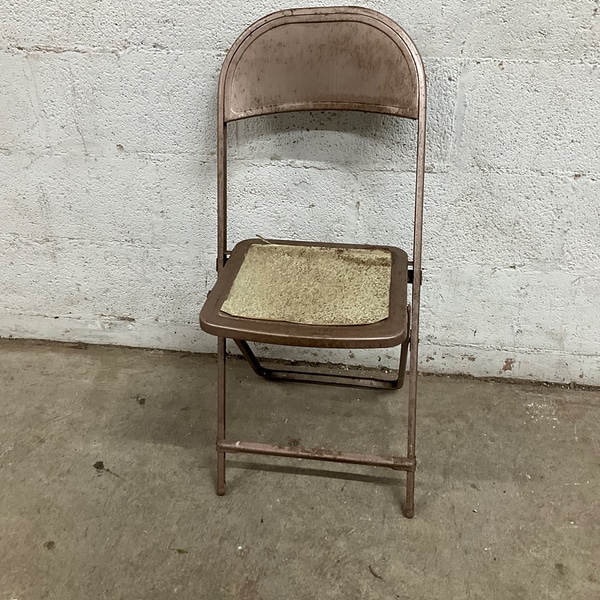 A mid-century metal folding chair with a padded seat. Ideal for vintage decor or extra seating in compact spaces.