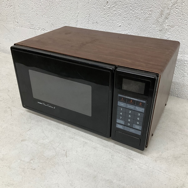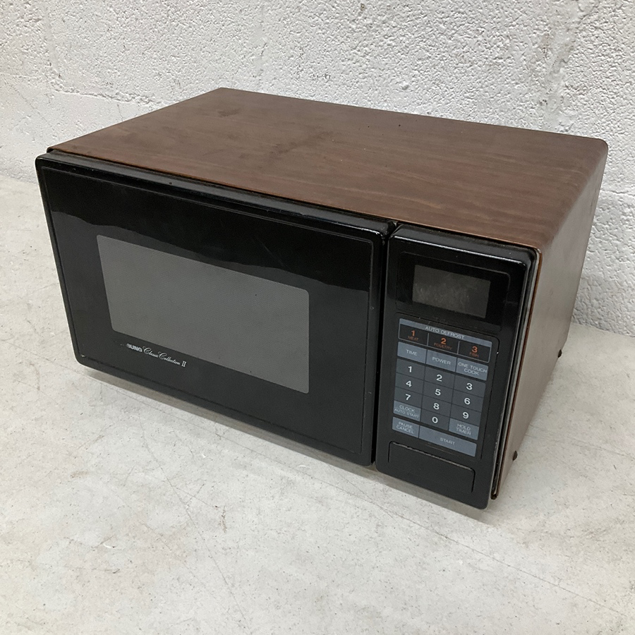Retro microwave with woodgrain finish. Ideal for kitchens or vintage-style decor. Includes digital keypad.
