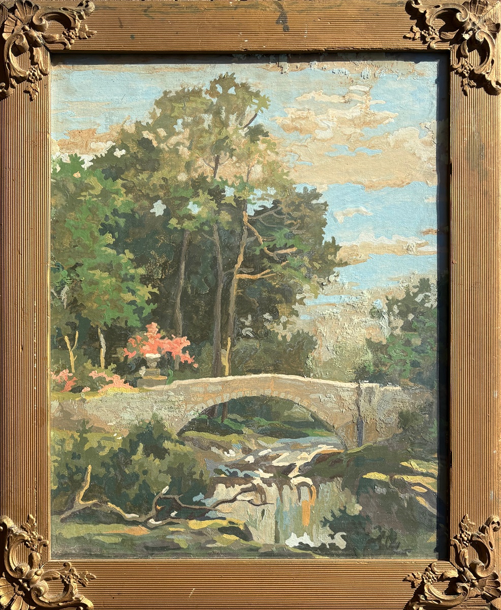 Rustic framed oil painting of a serene forest scene with a stone bridge.