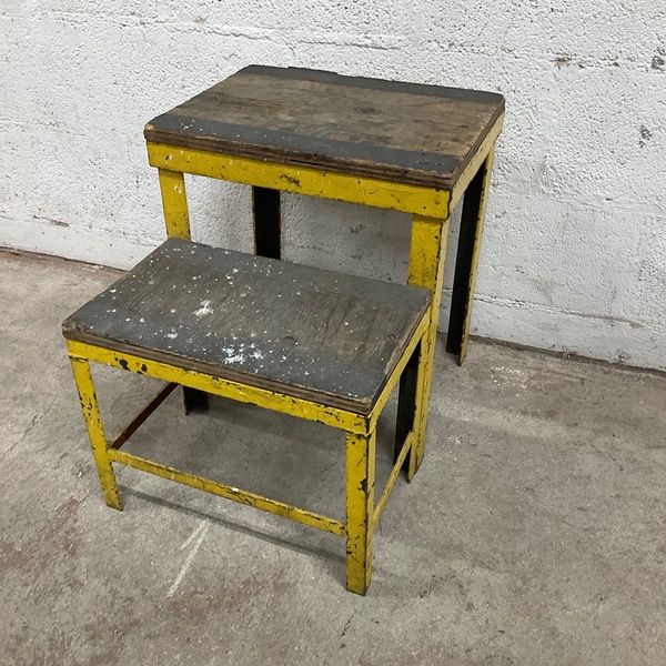 Rustic industrial step stools with worn wood tops and yellow metal frames. Ideal for furniture, tables, or decor.