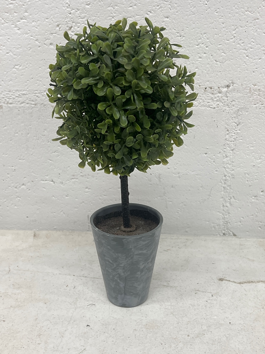 Lifelike faux topiary plant in a sleek gray pot. Perfect for indoor decor, enhancing living rooms, offices, or hallways.