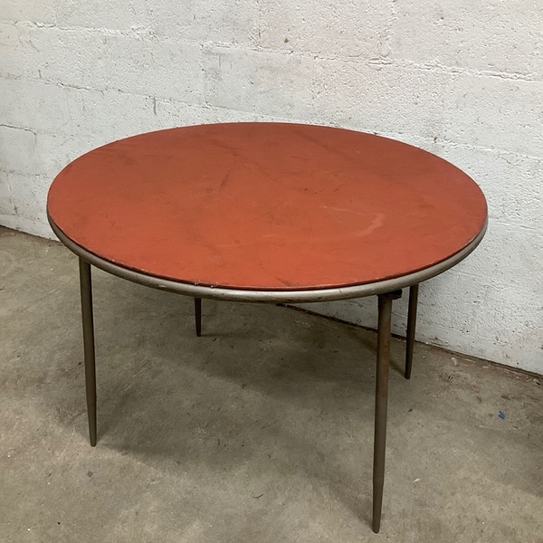 Vintage round table with a red top and metal legs. Perfect for living rooms or dining areas.