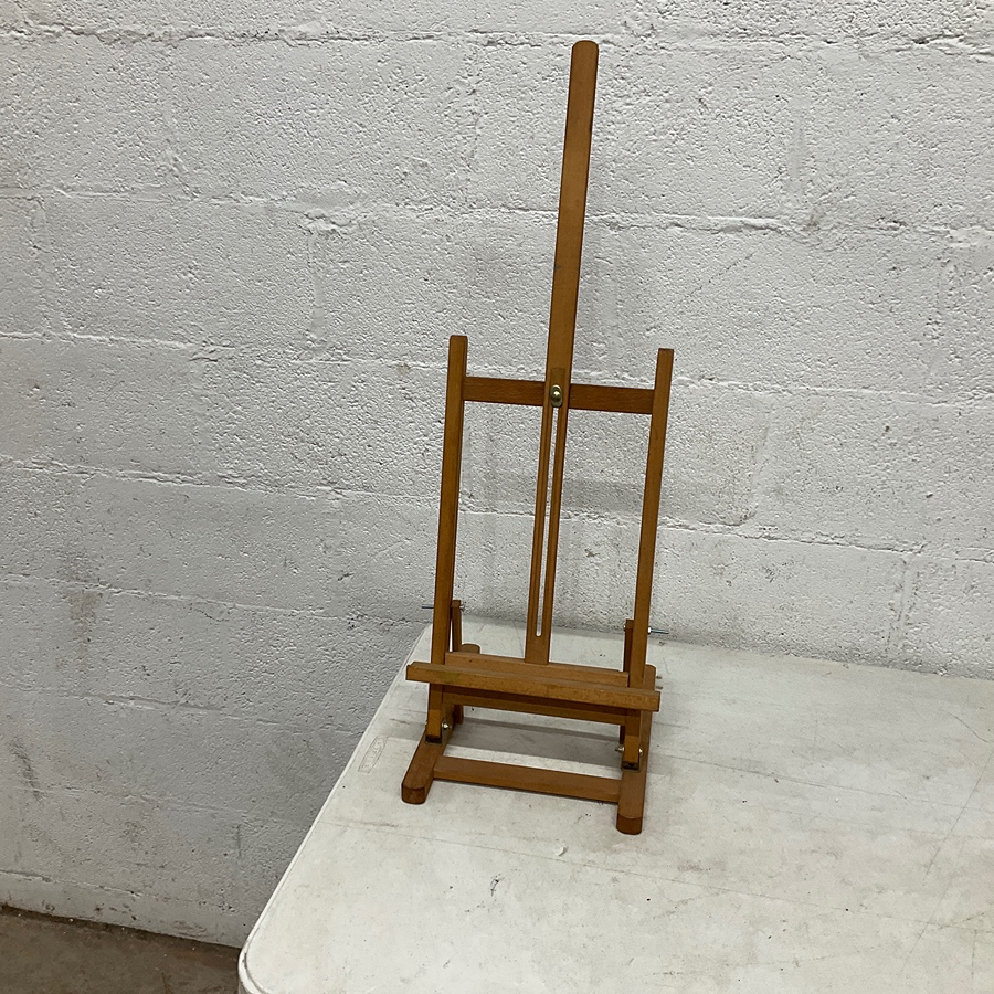 Compact easel for tabletop use. Ideal for artists. Made of wood, adjustable for various canvas sizes.