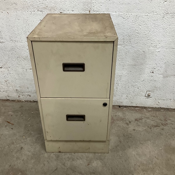 Two-drawer metal filing cabinet from a retro era. Durable and ideal for office storage.