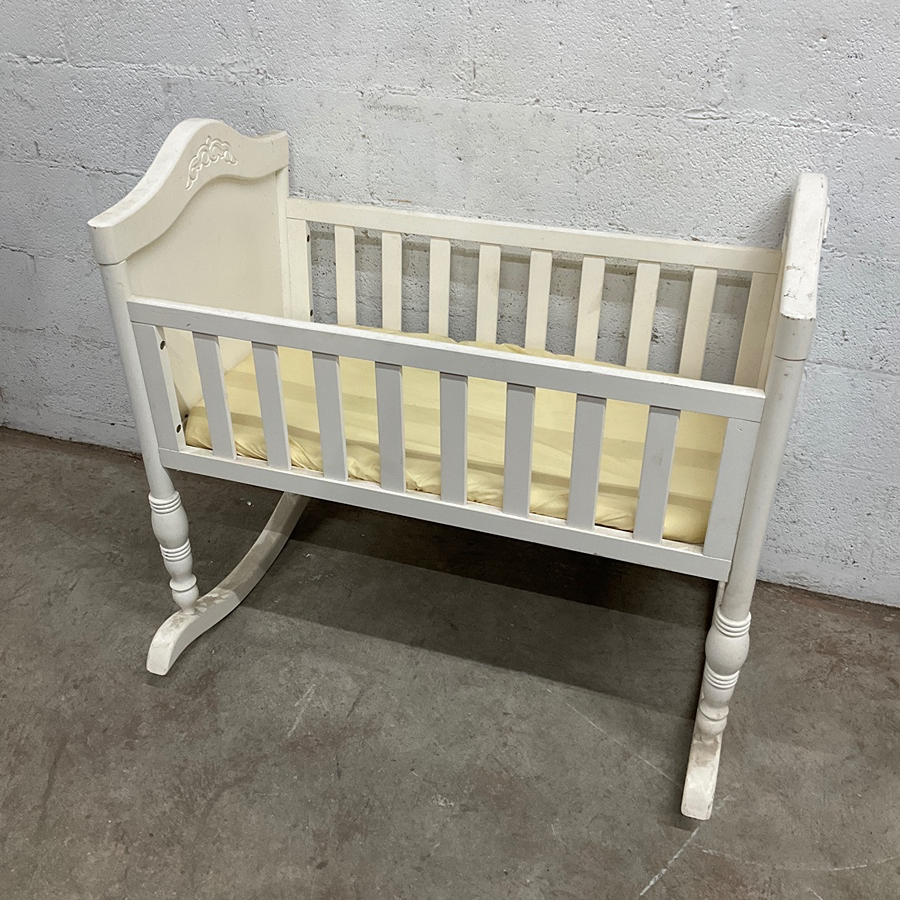 Classic wooden cradle with spindle design, perfect for nurseries. Features a white finish and elegant detailing.