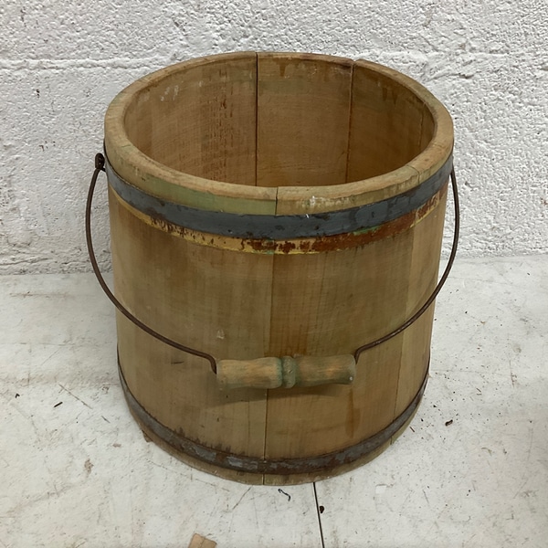 Rustic wooden bucket ideal for farmhouse decor or storage. Features a sturdy metal handle and natural wood finish.