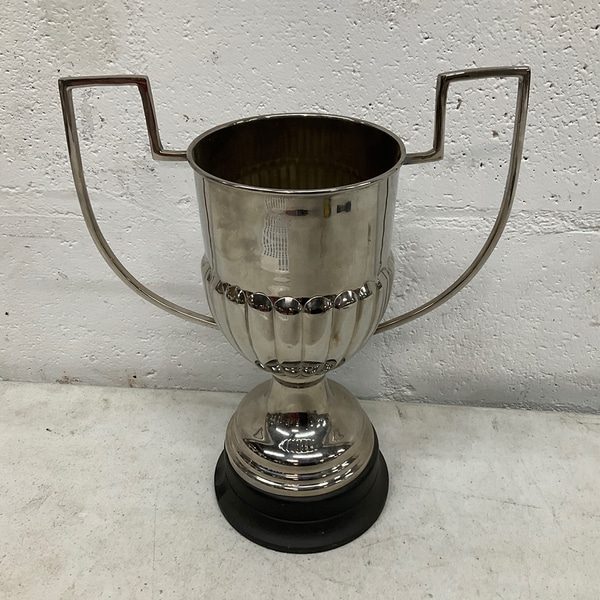 Elegant large silver trophy cup with intricate detailing and handles. Ideal for awards and recognition in any event.