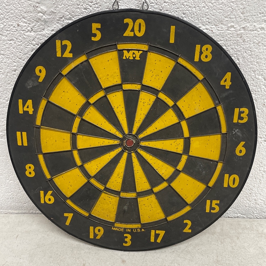 Classic dartboard featuring yellow and black segments with numbers. Ideal for game rooms and leisure spaces.