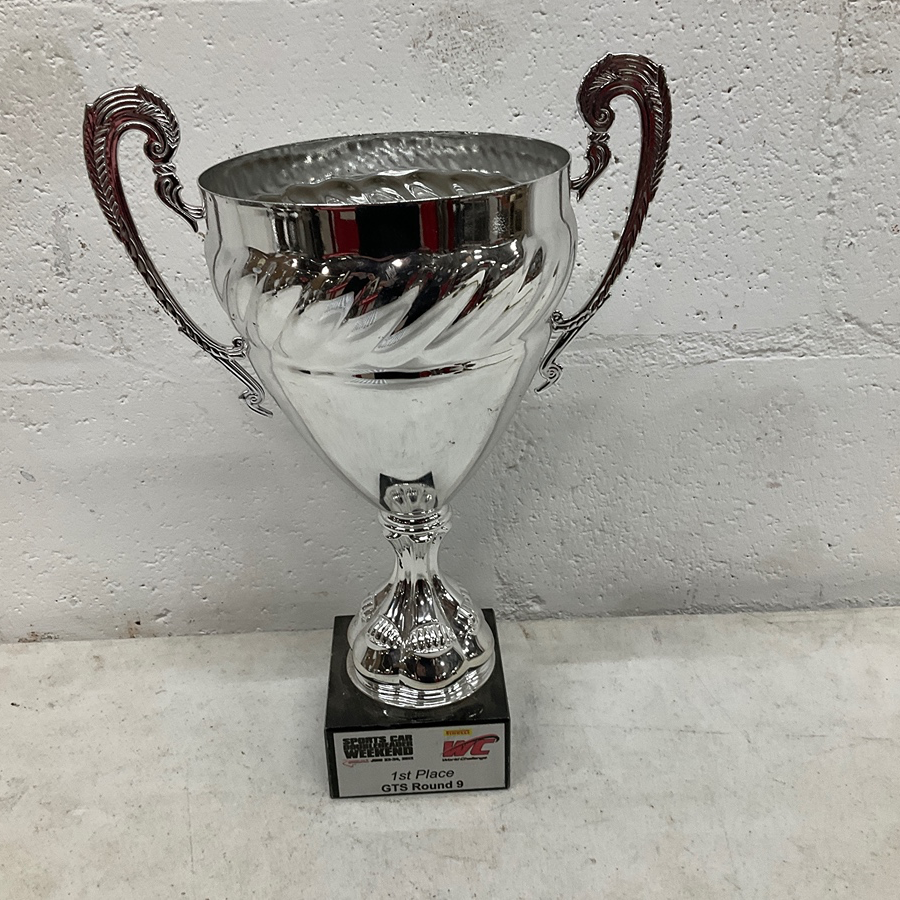 Stylish silver trophy cup with decorative handles and a black base. Perfect for awards, sports recognition, and achievements.
