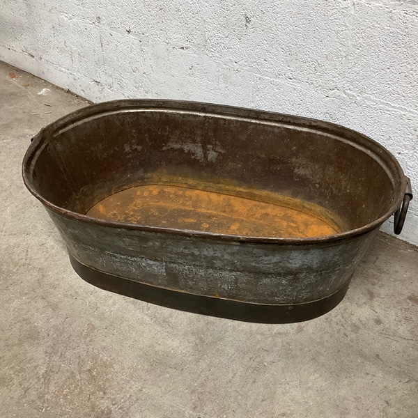 Rustic metal wash tub from mid 20th century. Ideal for garden decor or storage in rustic and vintage-themed spaces.