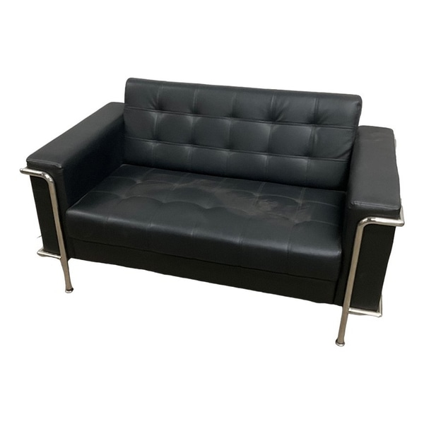 Modern loveseat with black leather upholstery and steel frame. Ideal for living rooms and contemporary spaces.