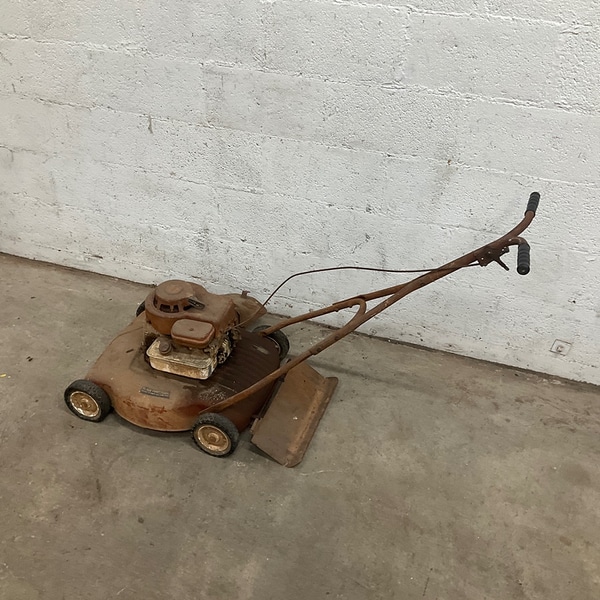 A classic push lawn mower from the mid-20th century, featuring a metal body with a rusted finish. Ideal for vintage decor.
