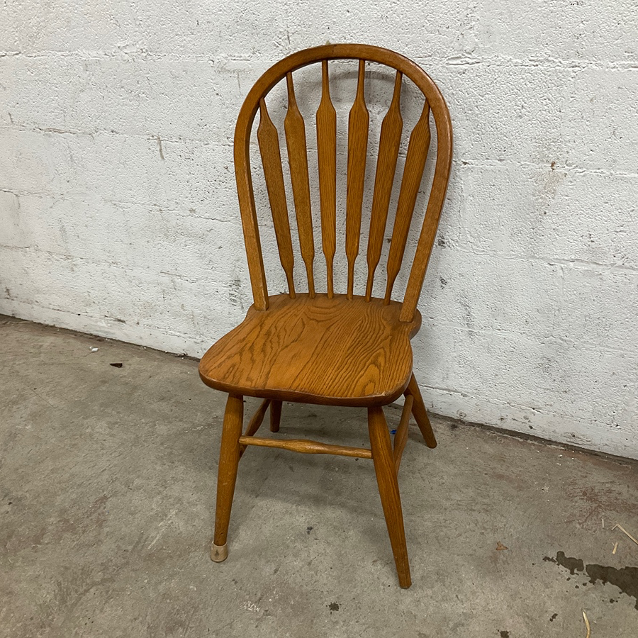 Classic vintage wooden chair ideal for dining rooms. Features a spindle backrest. Perfect for rustic or traditional decor.