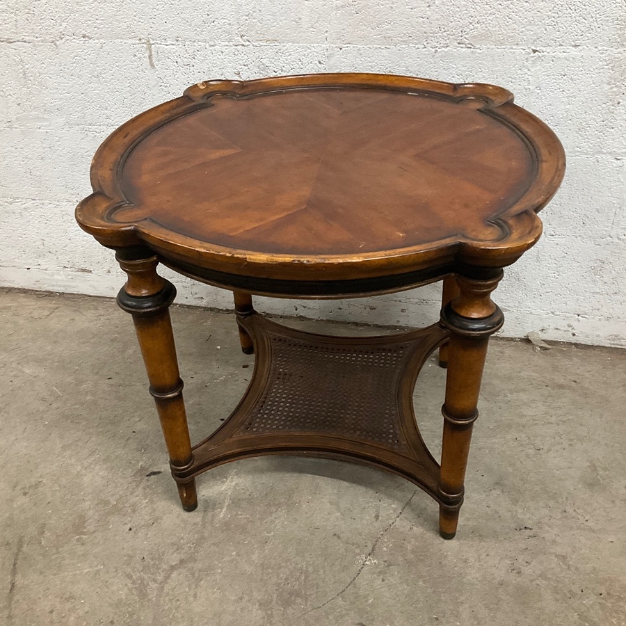 Round wooden side table with intricate carving, ideal for living rooms or vintage decor.