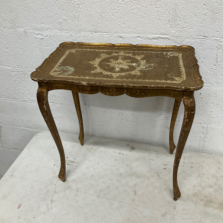 Ornate antique gold gilt wooden table with decorative patterns. Ideal for living rooms or vintage decor setups.