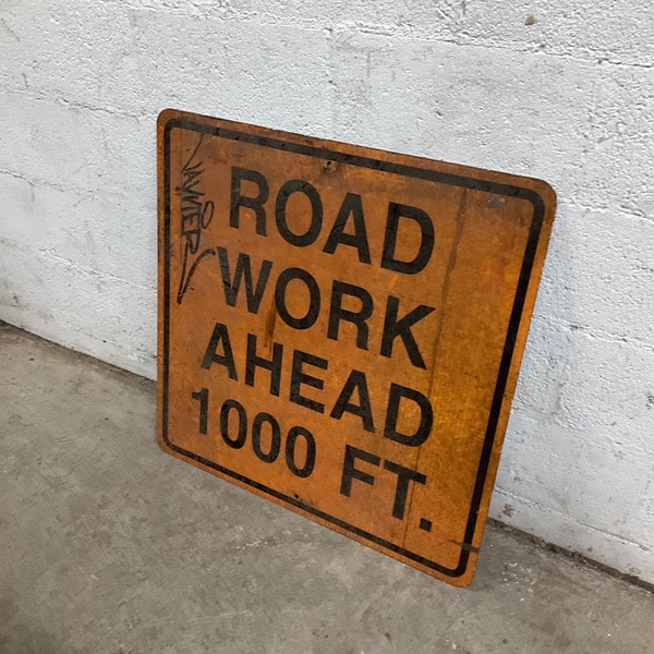 Vintage metal road work sign for decor. Adds industrial charm to spaces or collections. Features worn text and patina.