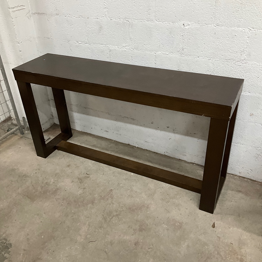Elegant brown wooden console table suitable for living rooms or entryways. Minimalist design perfect for various decor styles.