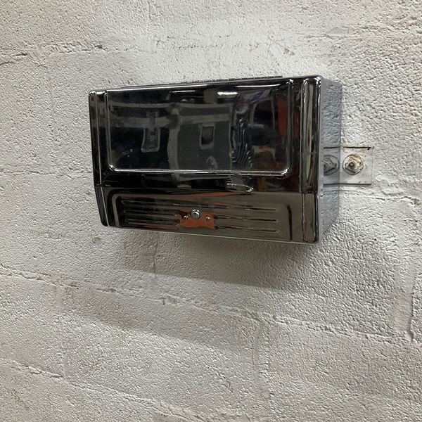 Industrial wall-mounted chrome dispenser for paper towels. Perfect for retro-style bathrooms or kitchens.