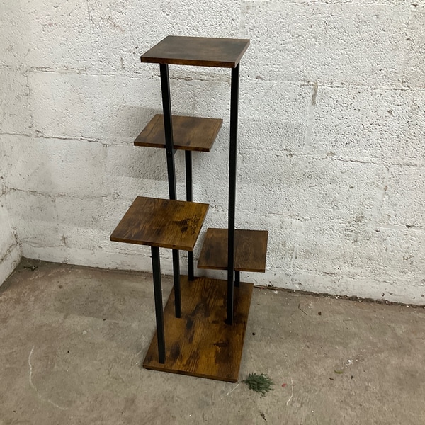 Rustic wooden and metal plant stand with multiple tiers. Ideal for displaying greenery in living spaces or patios.