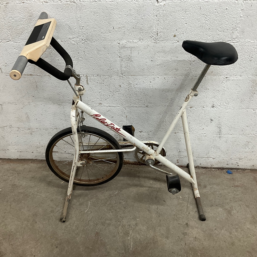 Retro exercise bike with a minimalist design. Ideal for home fitness spaces. Features a single wheel.