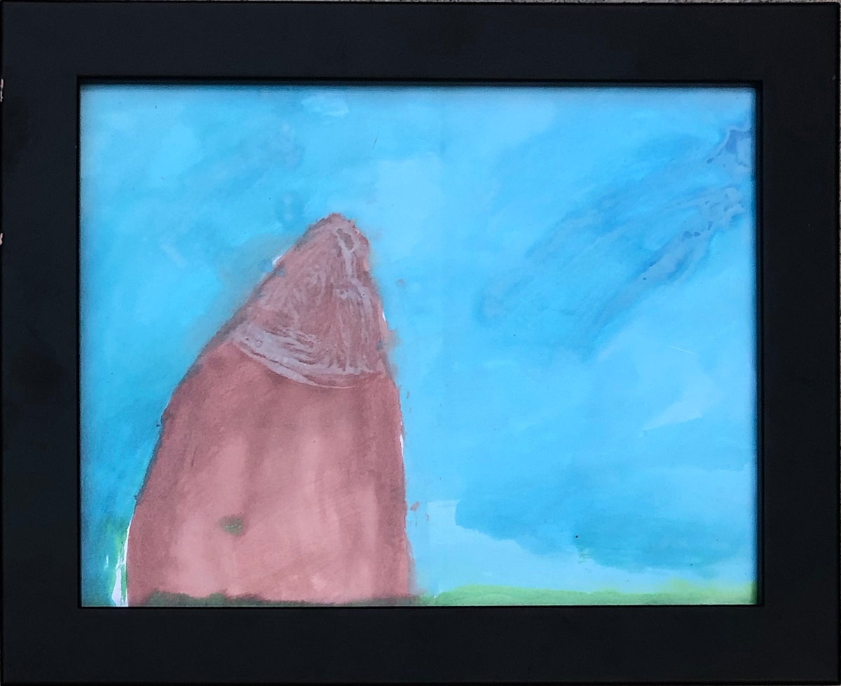 Framed abstract drawing featuring brown pyramidal shape against blue sky. Ideal for children's rooms or creative spaces.
